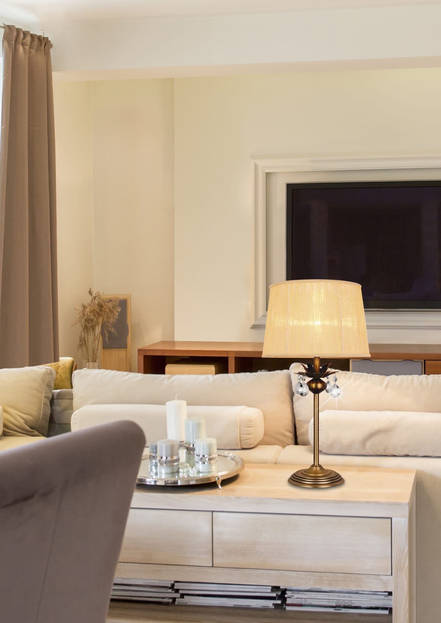 klasyczny salonowy szyk: charakterystycznie zdobiona metalowymi kulkami podstawa patynowa w połączeniu z estetycznym abażurem tasiemkowym wykończonym elegancką lamówką w kolorze kremowym; uroku dodają metalowe listki oraz zawieszone na nich dymione kryształki połyskujące w padającym na nie świetle.