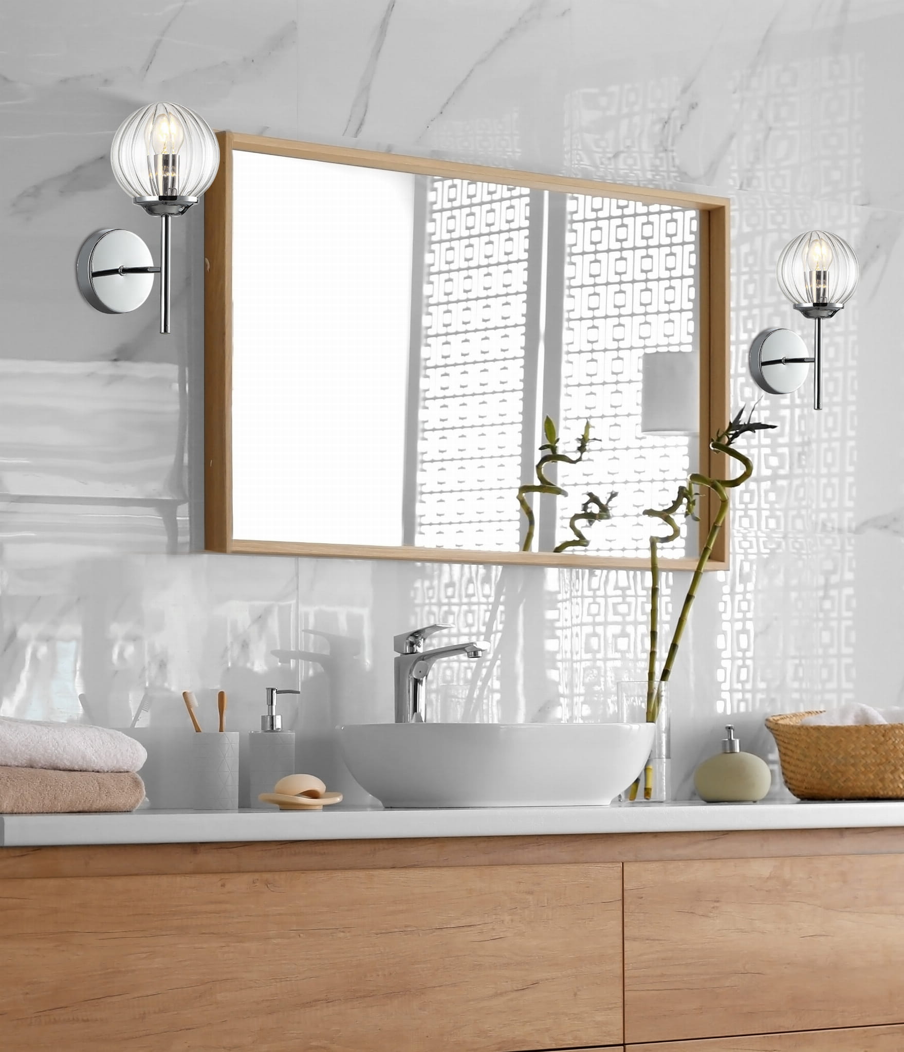 bardzo nowoczesna przestrzenna forma oprawy oswietleniowej, połączenie lustrzanego chromu z bezbarwnymi kloszami, wzbogaconymi subtelnym motywem; chromowane ozdobne tuleje na oprawkach dodają blasku po zaświeceniu