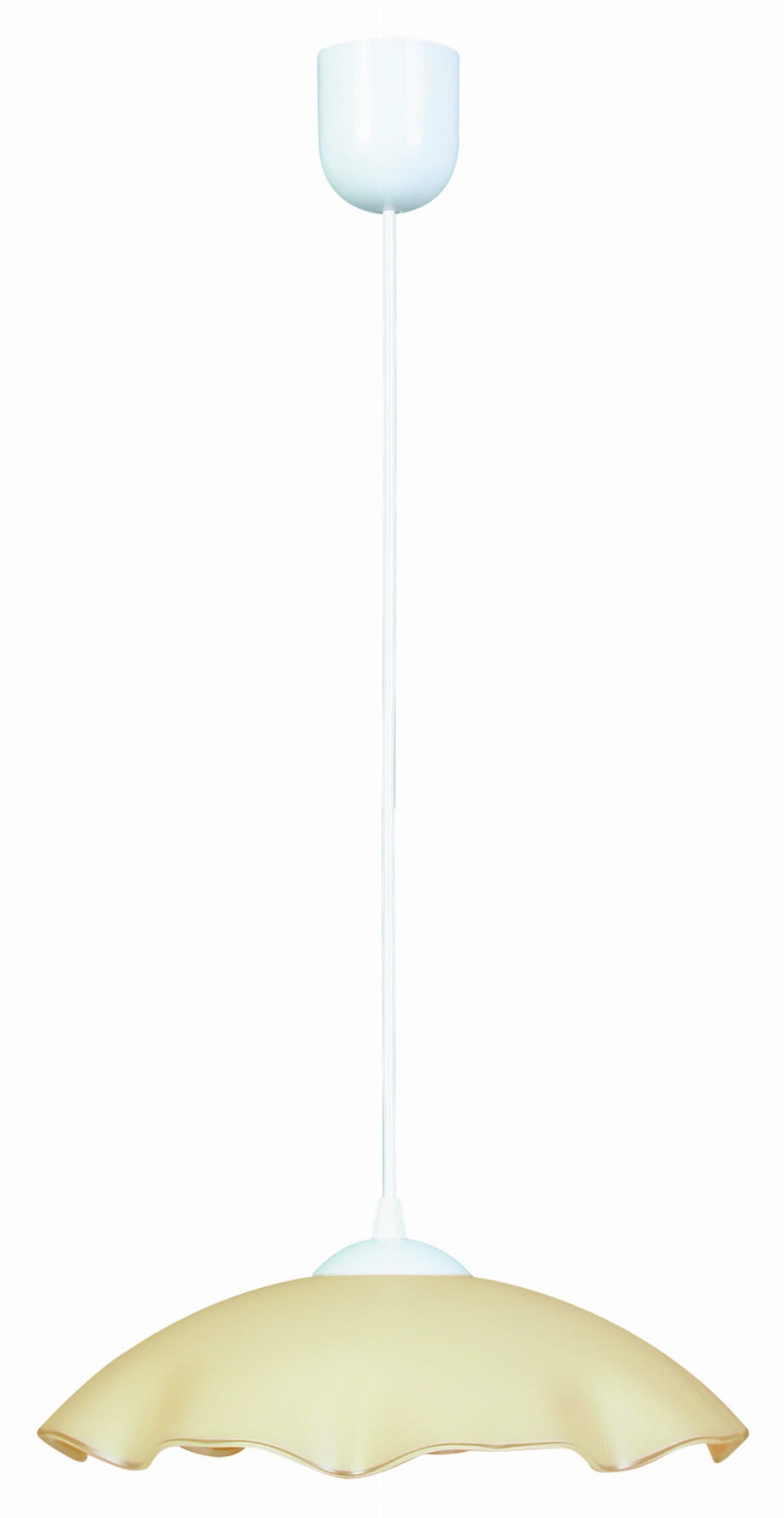 klosz ze szkła giętego, z oryginalnie ukształtowaną krawędzią na wzór falbanki po całym obwodzie, jednolity kolor uzyskany w procesie produkcji poprzez piaskowanie i malowanie, matowy po stronie zewnętrznej; zawieszony na lince plastikowej