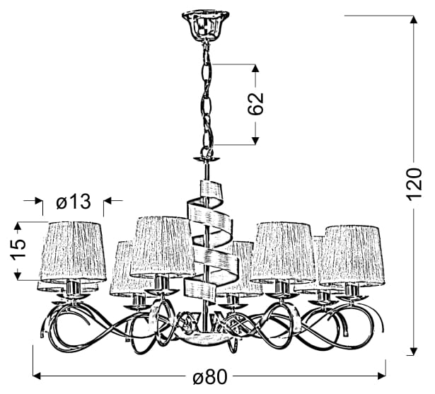 chromowa podstawa o oryginalnym kształcie i kunsztownym zdobieniu ramionek - metalową szarfą - w komplecie z białymi kreszowanymi abażurami; całość zawieszona na dekoracyjnym łańcuchu umożliwiającym regulację wysokości; produkt idealny do wnętrz wymagających odświeżenia aranżacji;