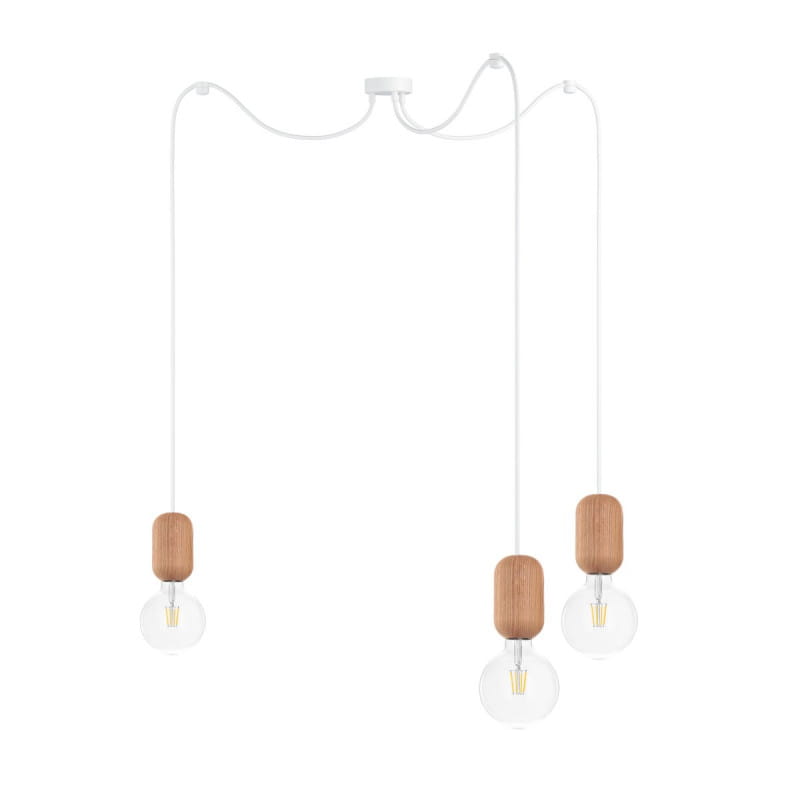 • lampa wisząca • długość kabla 3 x 1,5m • możliwość wybrania dodatkowej długości kabla • biała metalowa maskownica sufitowa • mosiężne blokady kabla • oplot poliestrowy 16 biały bez • przewód dwużyłowy 2 X 0.75mm2 • 3 x drewniana nakładka oprawki żarówki (średnica 80mm x wys. 135mm) • gwint E27 • uchwyty sufitowe w komplecie • zestawie nie ma żarówki (kup)
