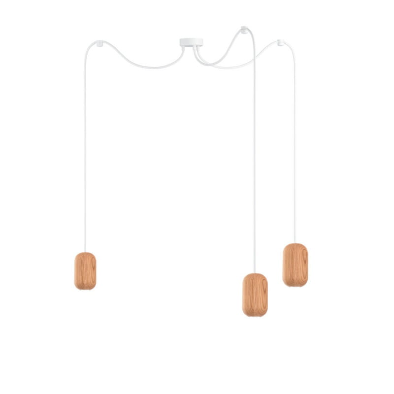 • lampa wisząca • długość kabla 3 x 1,5m • możliwość wybrania dodatkowej długości kabla • biała metalowa maskownica sufitowa • mosiężne blokady kabla • oplot poliestrowy 16 biały bez • przewód dwużyłowy 2 X 0.75mm2 • 3 x drewniana nakładka oprawki żarówki (średnica 80mm x wys. 135mm) • uchwyty sufitowe w komplecie • gwint GU10 MR11 • w zestawie nie ma żarówki (kup)