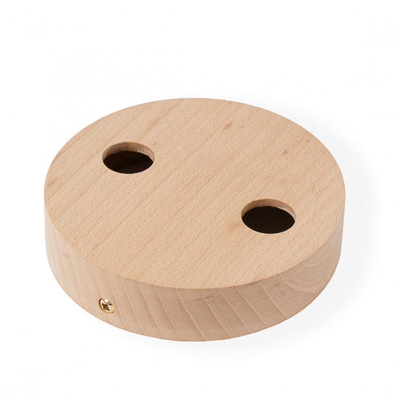 • drewniana maskownica sufitowa • możliwość zamontowania grubej liny jutowej w dwóch otworach • średnica ~130mm • wysokość ~28mm • doskonale dopasowana do liny jutowej o średnicy 26 mm