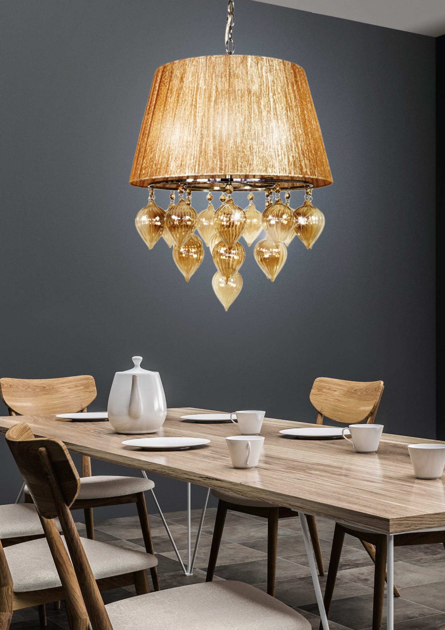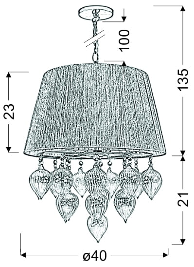 prawdziwy rarytas dla prawdziwego konesera oświetlenia; jedyne czego potrzebuje to przestrzeni; połyskujący kreszowany abażur skompletowany z delikatnymi szklanymi bombkami; jednolity kolorystycznie; zawieszony na elegnckim łańcuchu umożliwiającym regulację wysokości; niezastąpiony w dostojnym salonie;
