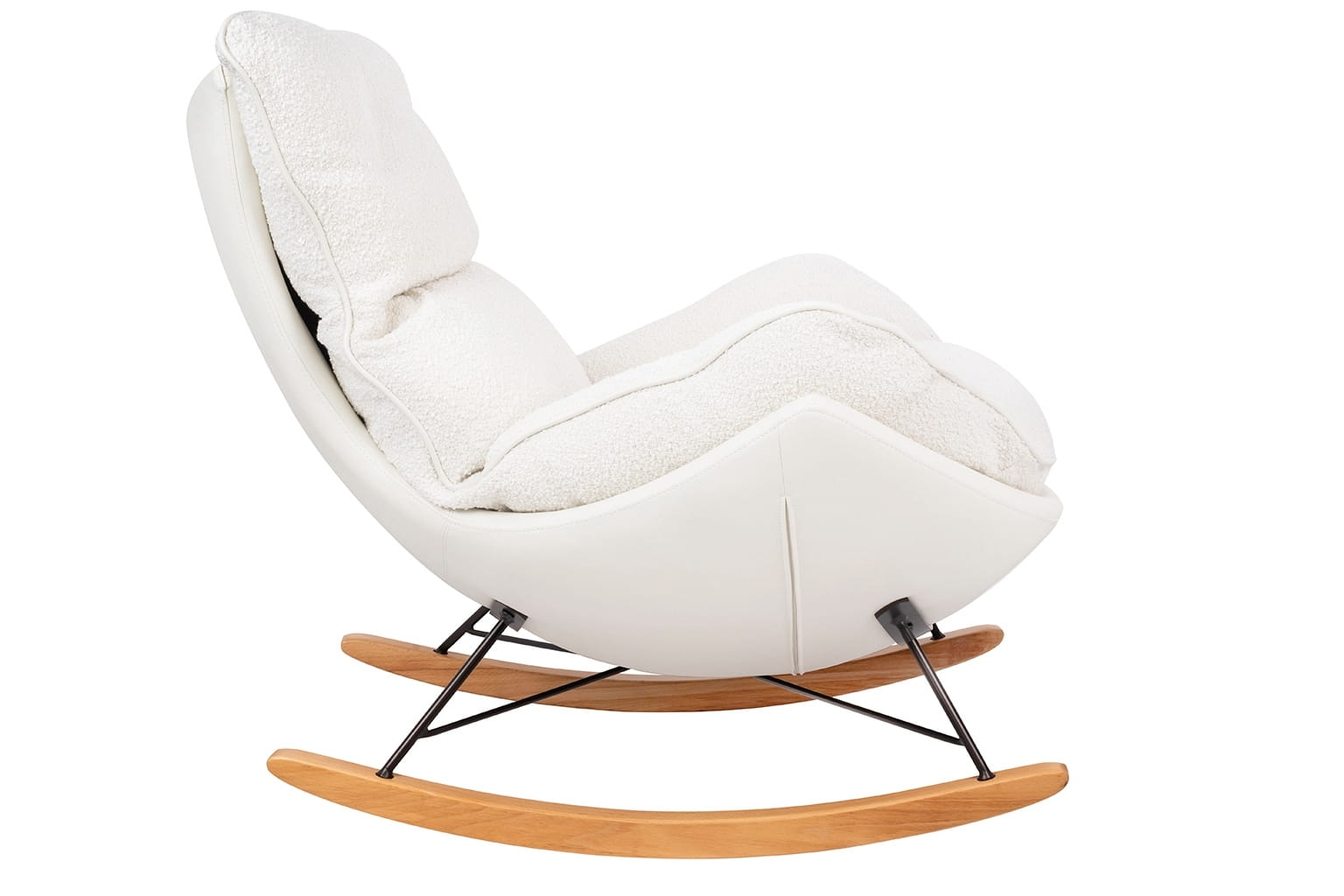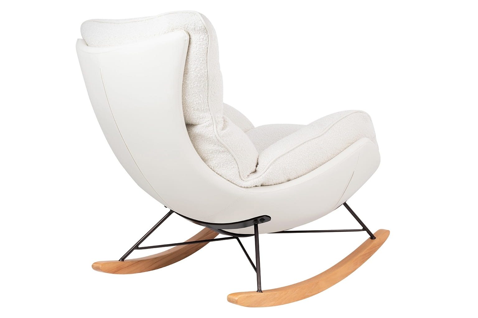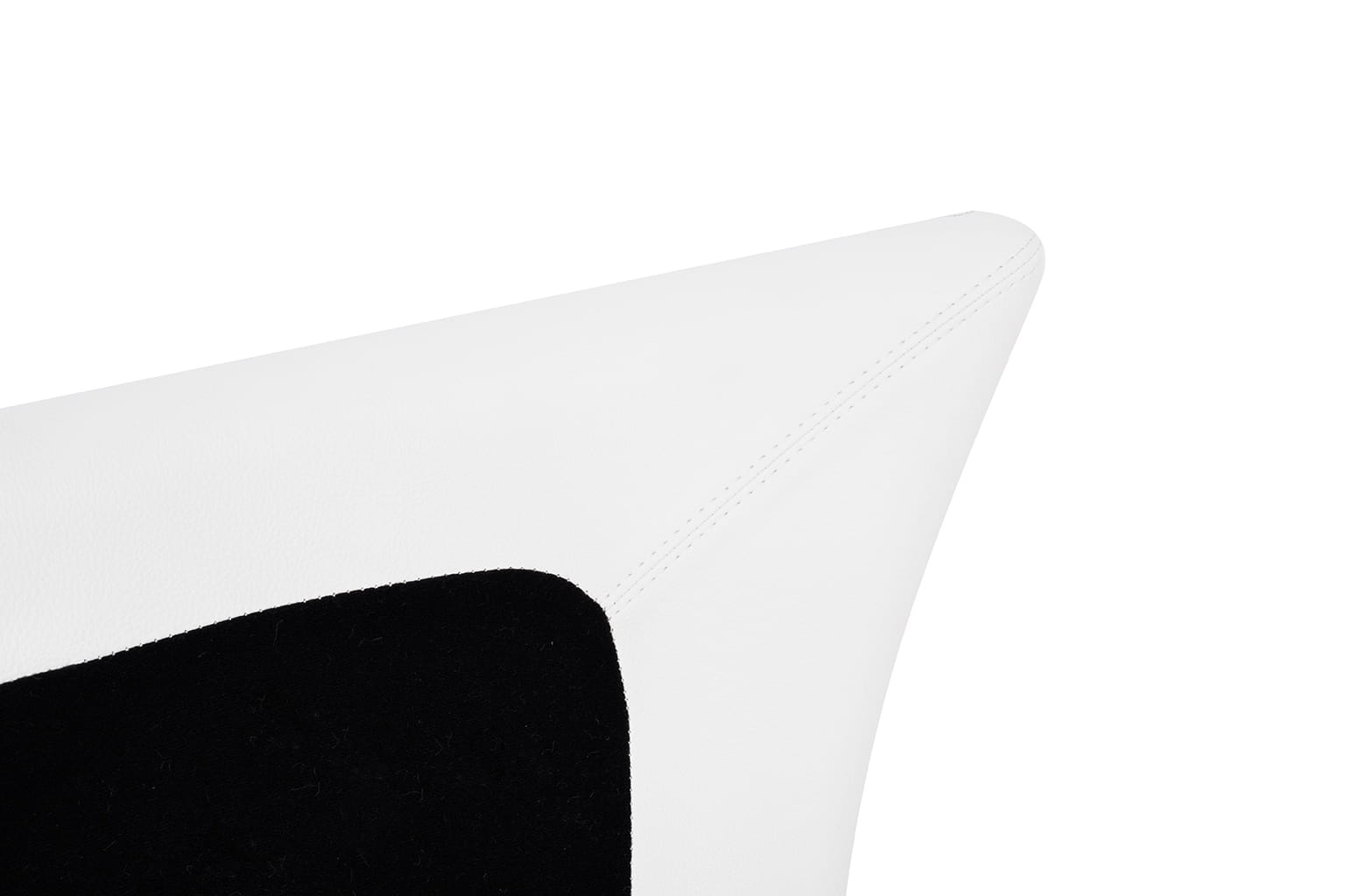 Metalowy korpus fotela tapicerowany ekoskórą w kolorze białym.