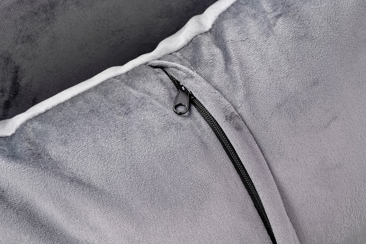 Siedzisko oraz poduszka tapicerowane są aksamitnym welurem w kolorze ciemnej szarości.