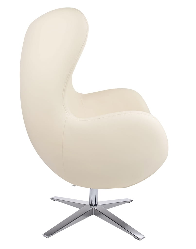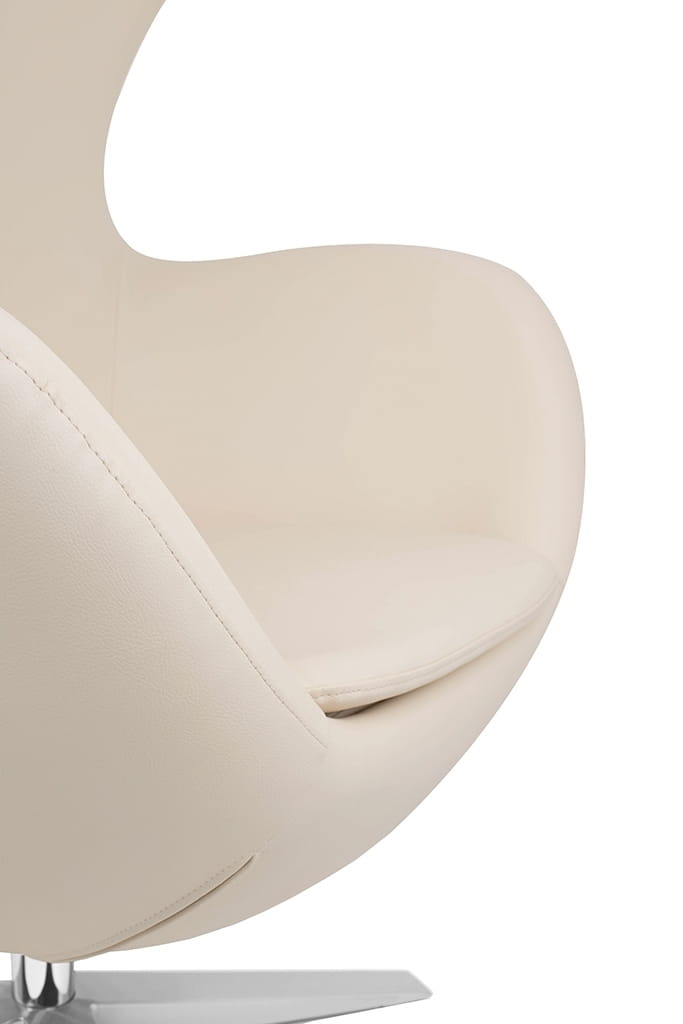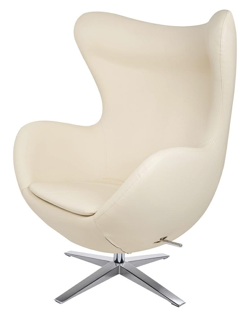 Fotel EGG SZEROKI kształtem nawiązuje do jednego z najbardziej znanych projektów.Wyposażony jest w mechanizm obrotowy z funkcją bujania. Dodatkowo fotel można zablokować w pozycji odchylonej lub pionowej.Ciekawym elementem jest dekoracyjny suwak na plecach fotela. Fotel tapicerowany jest ekoskórą w kolorze beżowym.Korpus fotela jest wykonany z metalu, a podstawa oraz uchwyt ze stali polerowanej.Za dopłatą isnieje możliwość zmiany koloru podstawy. Wymiary: wys. 110 cm / szer. 80 cm / gł. 70 cmWysokość do krawędzi siedziska: 44 cmWysokość do podłokietników: 65 cmWaga netto: 22 kgWymiary opakowania: 78 cm / 83 cm / 110,5 cmSposób wysyłki: paleta.