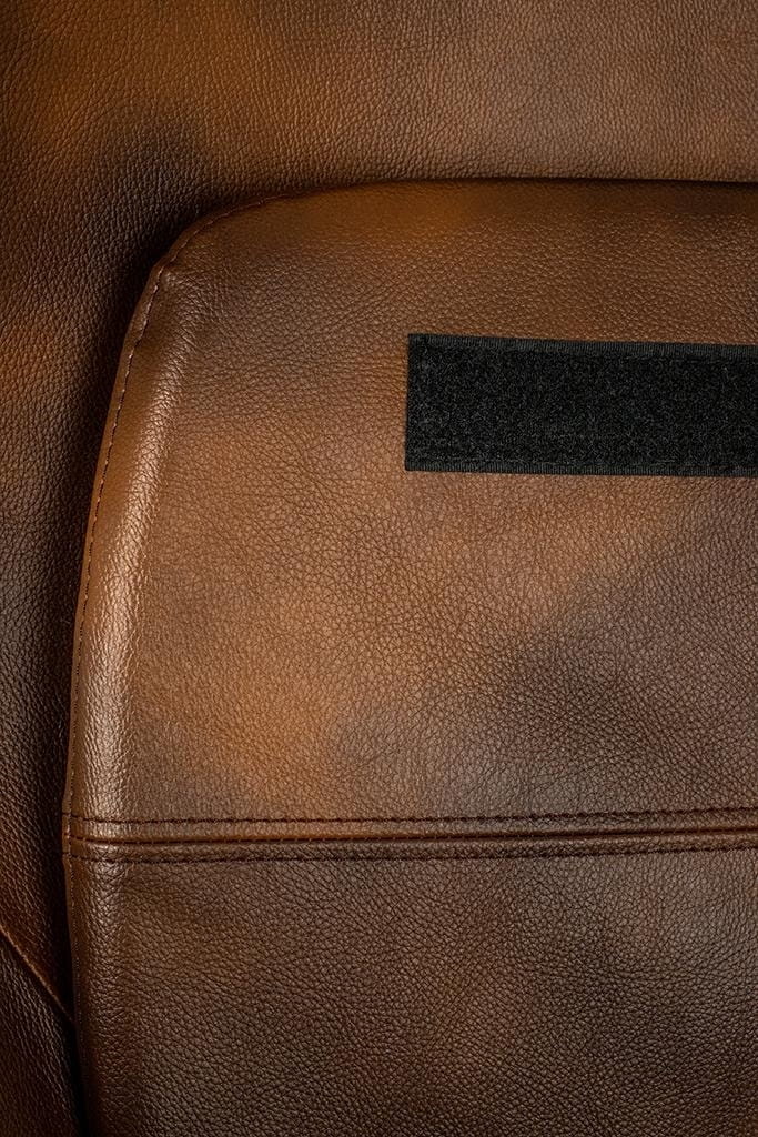 Ciekawym elementem, jest dekoracyjny suwak na plecach fotela. Fotel tapicerowany jest ekoskórą w kolorze vintage czekolada.