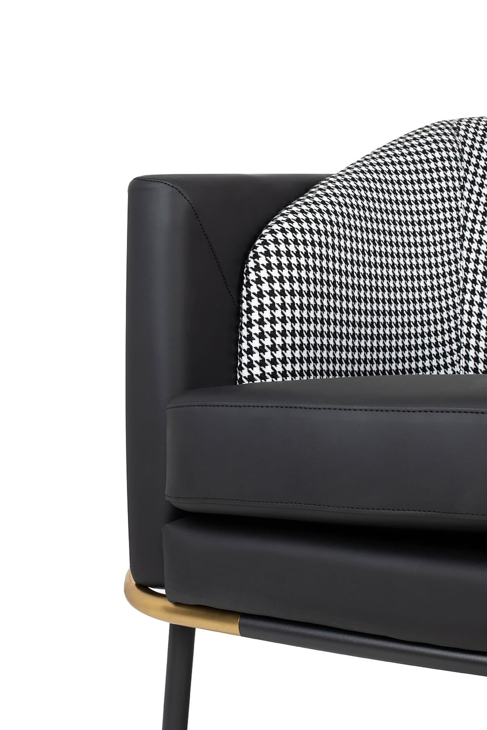 Oparcie obszyte jest tkaniną w biało-czarną pepitkę, a czarna, metalowa podstawa została udekorowana złotymi wstawkami.