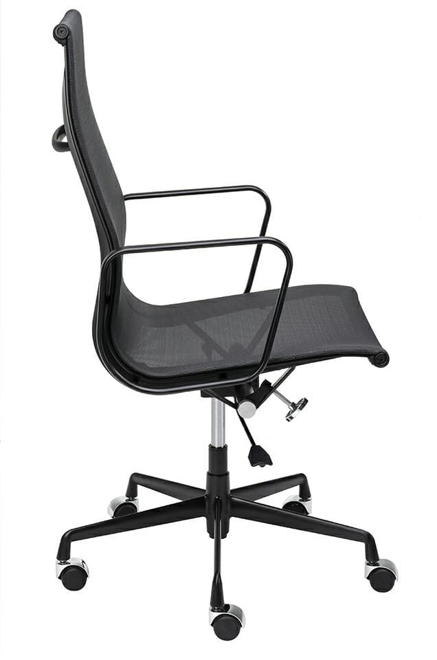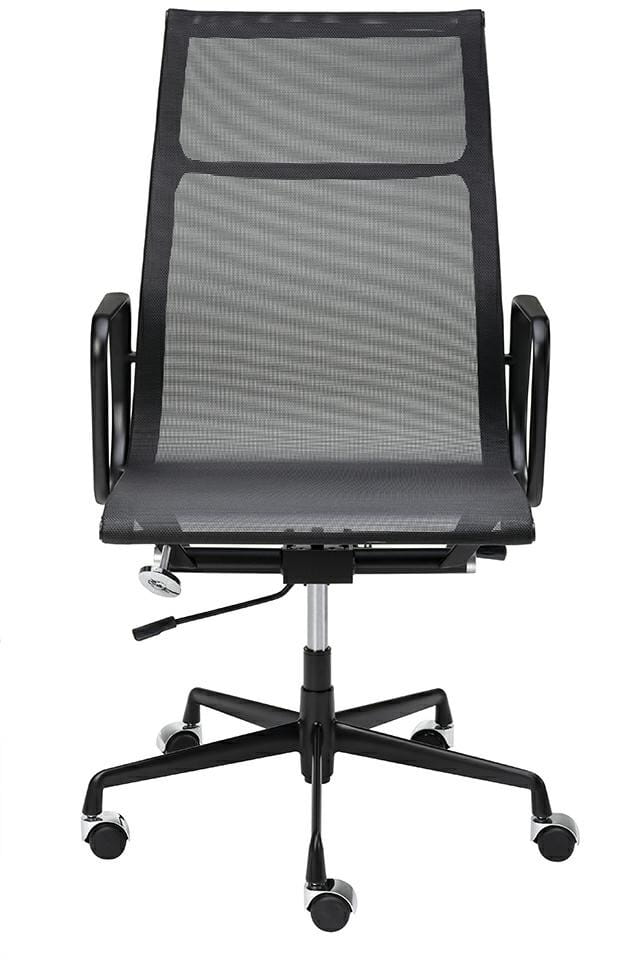 Fotel biurowy Aeron Premium w kolorze czarnym. Minimalistyczna forma która wprowadzi elegancki akcent do twojego biura. Cała konstrukcja wykonana jest wytrzymałego aluminium w czarnym, satynowym kolorze. Siedzisko i oparcie wykonane zostały z wytrzymałej, przepuszczającej powietrze czarnej siatki. Chromowane kółeczka podkreślają charakter fotela. Fotel jest obrotowy z funkcją bujania oraz regulacją wysokości w zakresie 11 cm. Wyprofilowane oparcie i siatkowa tkanina zapewnią odpowiedni komfort i wygodę pracy. Wymiary: wys. 97 - 108 cm / szer. 51 cm / gł. 56 cm Waga netto: 15 kg Wymiary opakowania: 86 cm / 41 cm / 65 cm.