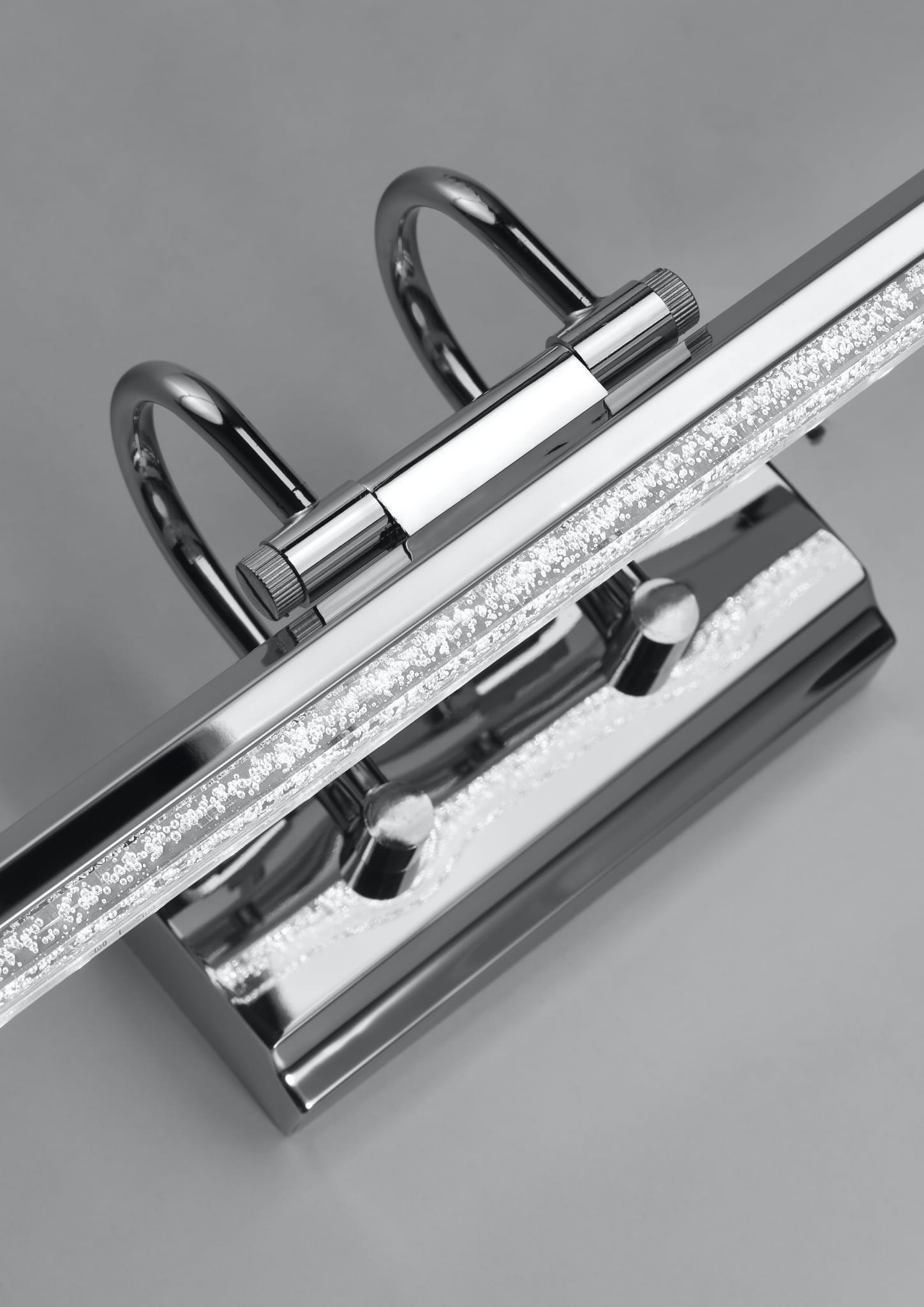stylowa kombinacja chromu z transparentnym akrylem; wewnątrz akrylowego klosza dekoracyjne pęcherzyki powietrza, szczególnie wyraziste po zaświeceniu oprawy, imponująco odbijąjące się w lustrzanej powierzchni chromowej podstawy; ruchome połączenie ramienia z kloszem umożliwia regulację kąta padania światła; idealna propozycja nad lustro