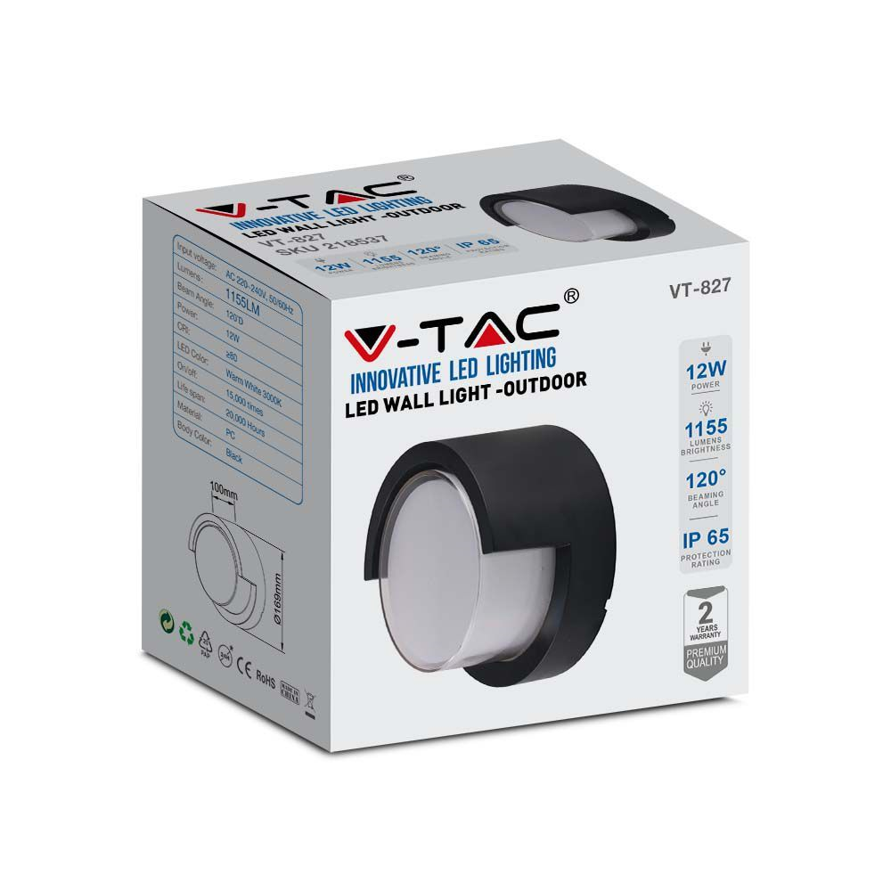 Kinkiet Zewnętrzny Oprawa Ścienna V-Tac 12W Led Ip65 Czarna Okrągła Vt-827 4000K 1155Lm