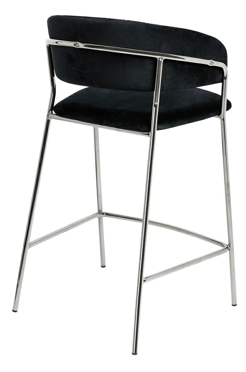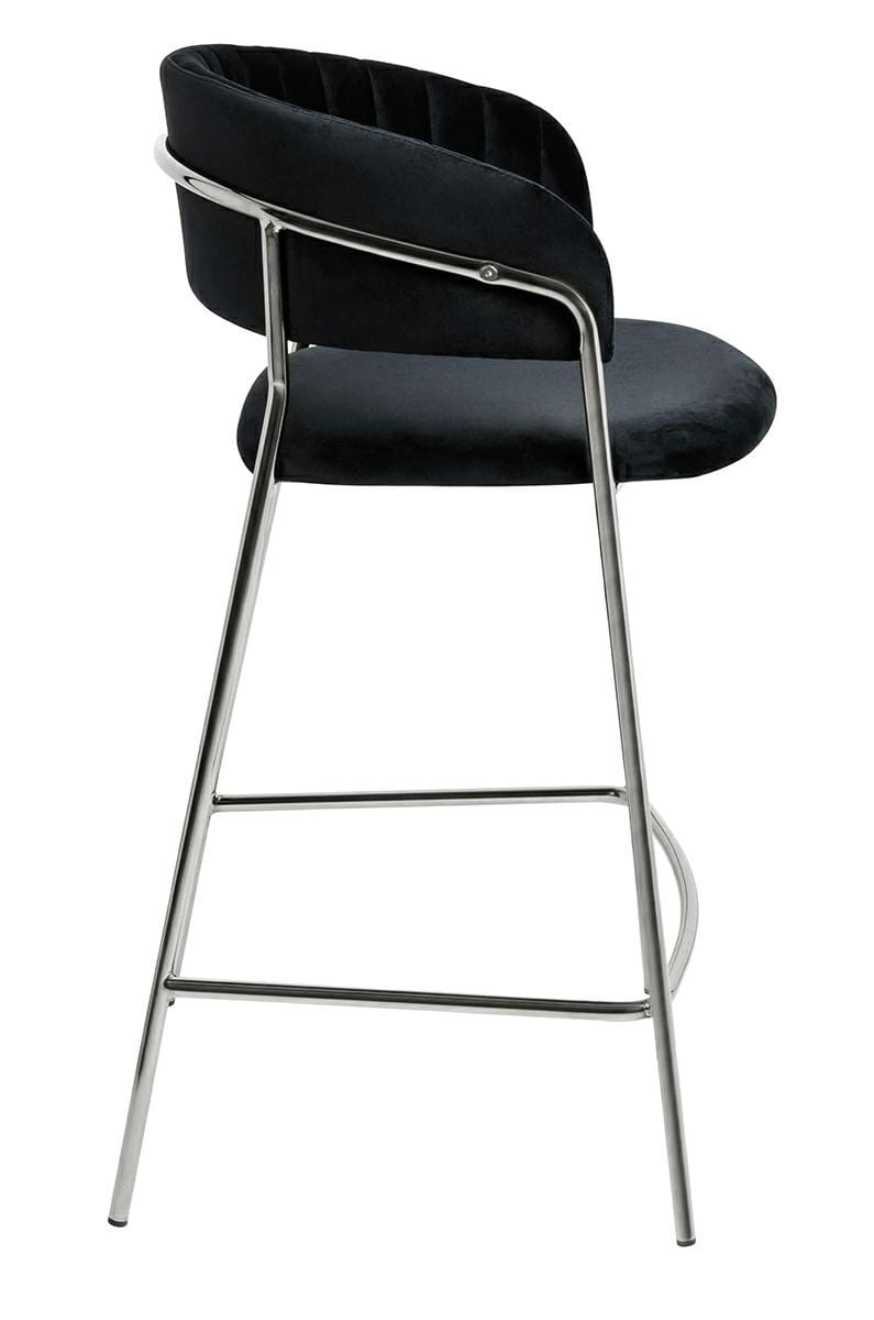Krzesło barowe Margo w kolorze czarnym.Siedzisko i oparcie tapicerowane miękkim i przyjemnym w dotyku welurem.Mocna i stabilna konstrukcja wykonana została z metalu w kolorze błyszczącego chromu.Pionowe przeszycia na oparciu dodają elegancji.Margo idealnie odnajdzie się we wnętrzach nowoczesnych i klasycznych.Wymiary: wys. 89 cm / szer. 53,5 cm / gł. 52 cmWysokość do krawędzi siedziska: 65 cmSiedzisko: szer. 47 cm / gł. 43 cmRozstaw nóg: szer. 53,5 cm / gł. 54 cmWaga netto: 6 kgWymiary opakowania: 105 cm / 54 cm / 64,5 cm.