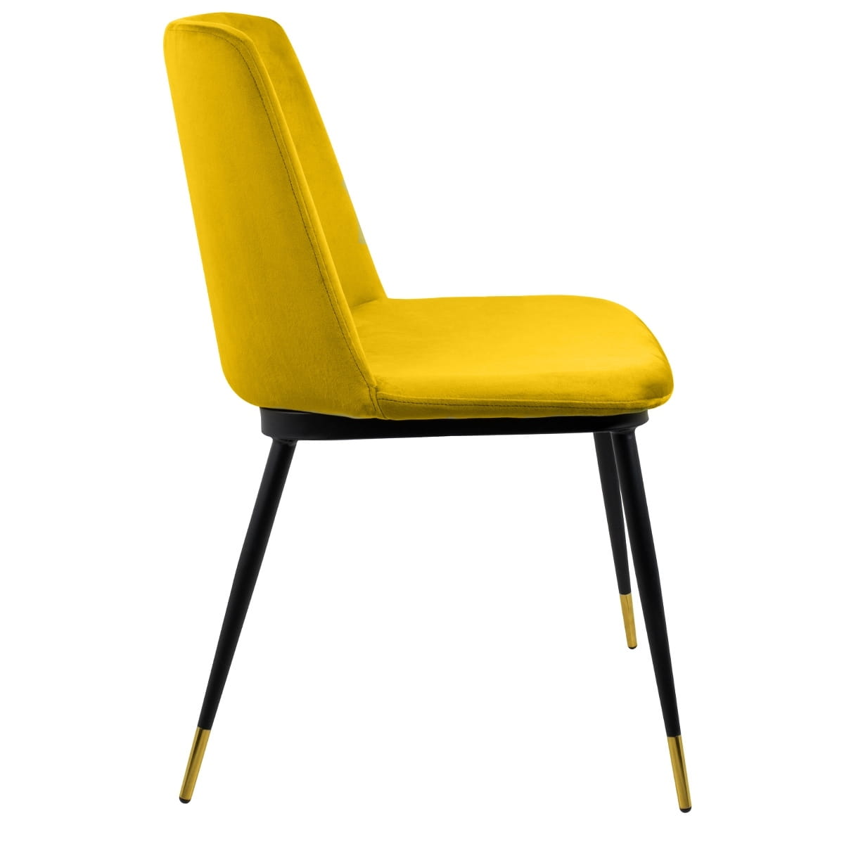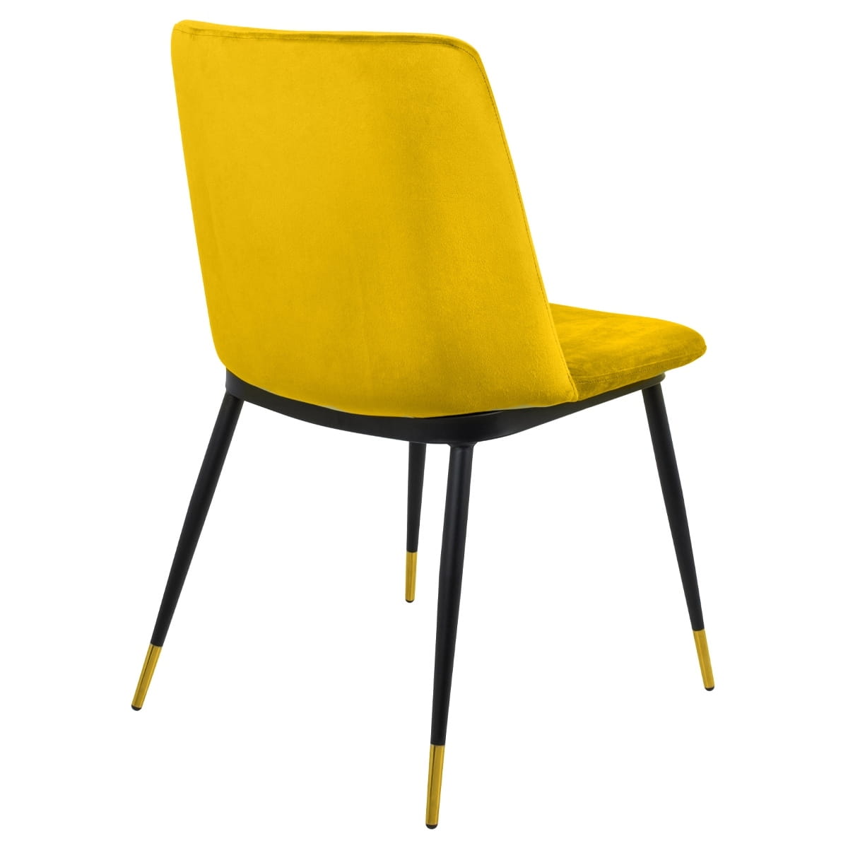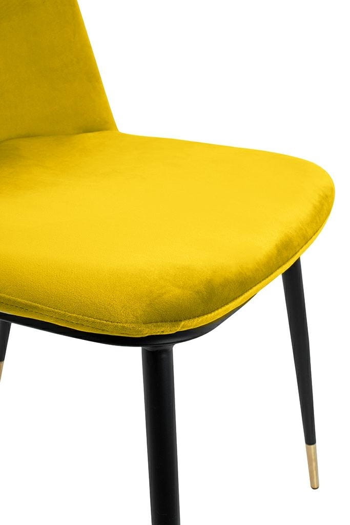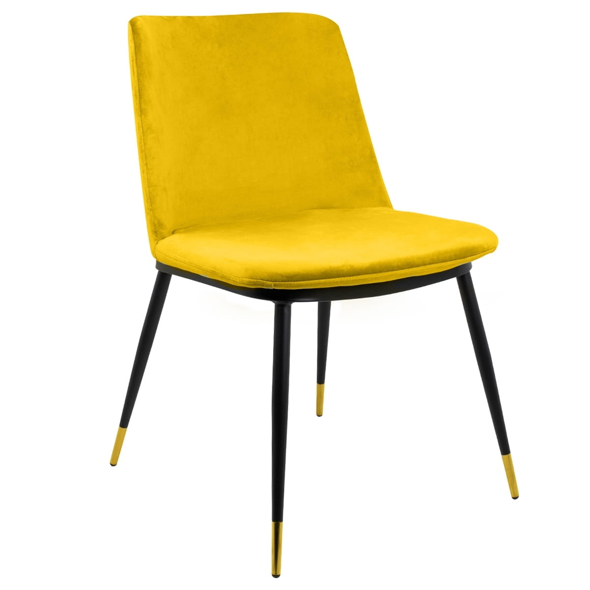 Krzesło Diego w kolorze żóltym.Siedzisko i oparcie tapicerowane miękkim i przyjemnym w dotyku welurem. Konstrukcja z metalu w kolorze czarnym z satynowym wykończeniem. Ciekawym elementem dekoracyjnym są złote zakończenia nóg. Krzesło doskonale odnajdzie się w jadalni, gabinecie oraz pokoju dziennym.Wymiary: wys. 82 cm / szer. 50 cm / gł. 58 cmWysokość do krawędzi siedziska: 47 cmSiedzisko: gł. 46 cmOparcie: wys. 37,5 cmWaga netto: 7,5 kg.Wymiary opakowania: 66 cm / 60 cm / 61 cm.