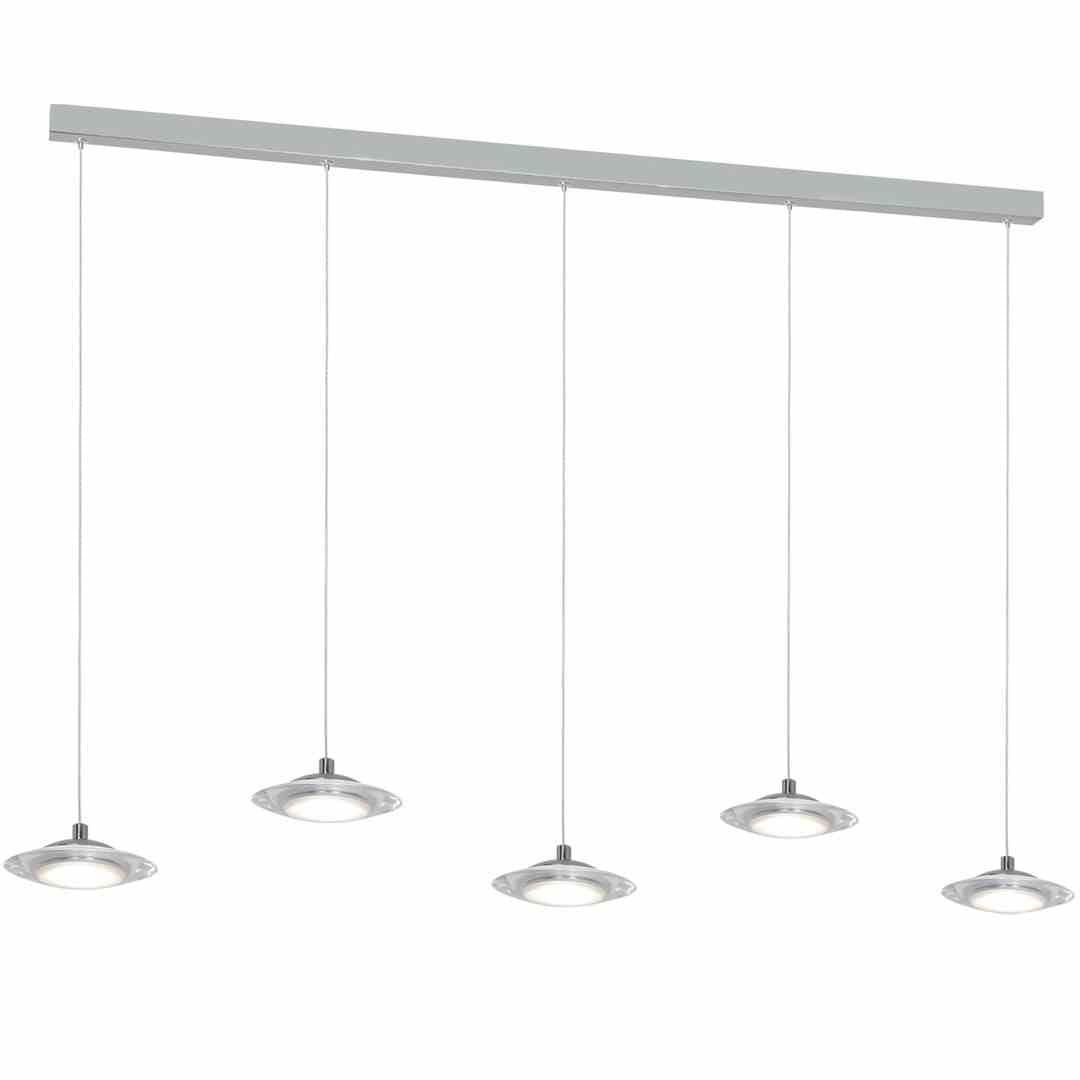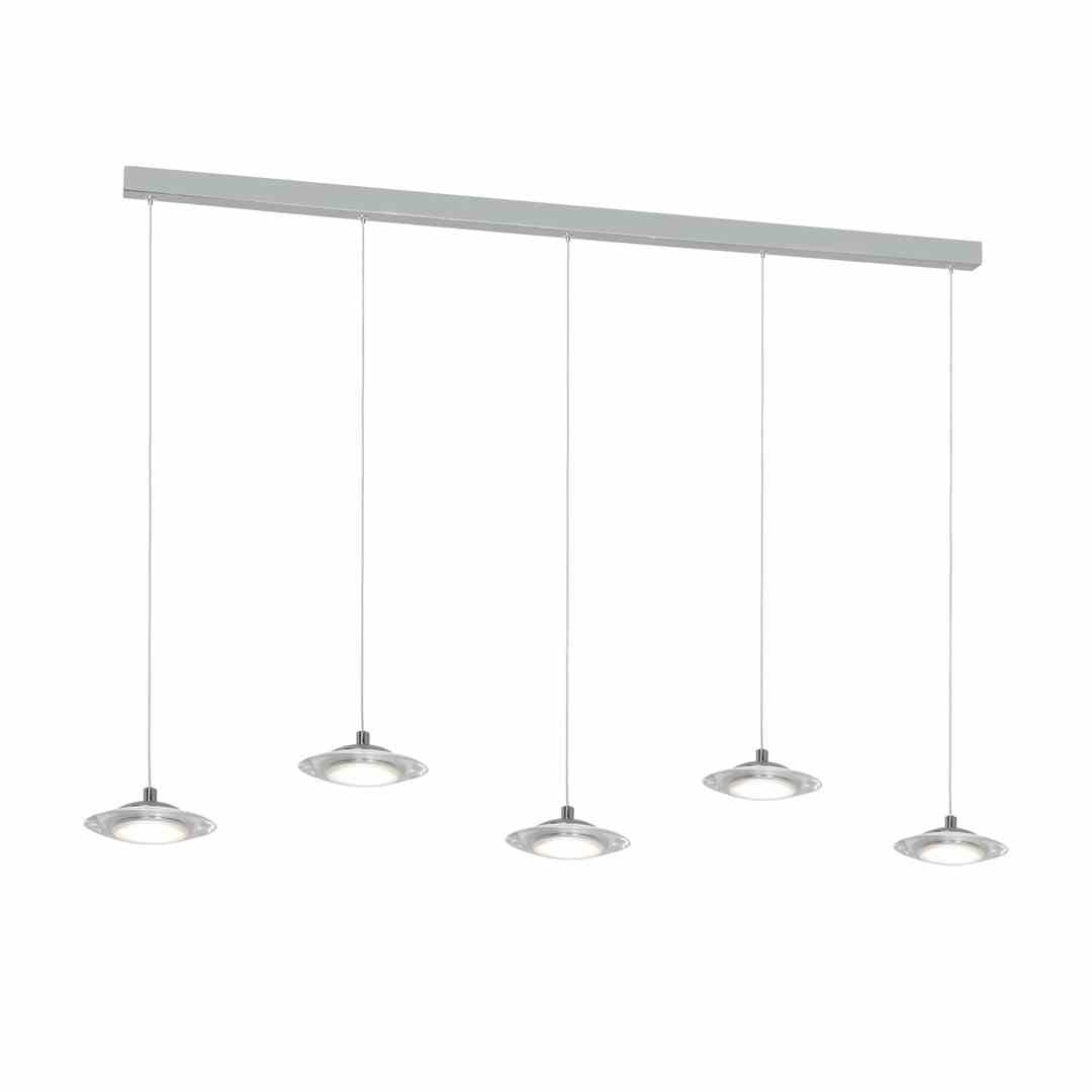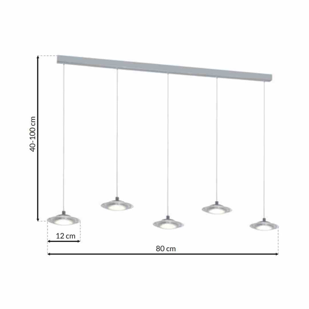 "Nowoczesna wisząca lampa LED jest połączeniem współczesnego wzornictwa, starannego wykonania oraz najlepszych materiałów. Posiada 5 punktów światła, które można dowolnie regulować od 40 do 100 cm wysokości. Łączna moc modułów LED to 25 W, które odpowiadają 126 W tradycyjnej żarówki. Do tego jasny strumień świetlny - 1750 lm o neutralnej białej barwie 4000 K. Szerokość elementu świetlnego to 80 cm, z kolei średnica każdego klosza wynosi zaledwie 12 cm. Lampę wykończono w eleganckim i stylowym chromie.