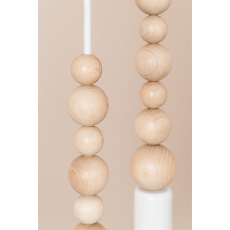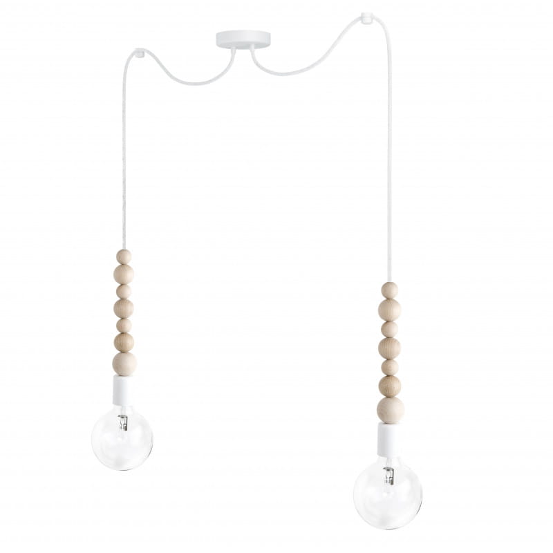 • lampa wisząca • oplot bawełniany B09 biała perła • długość całkowita 1,6 m • kulki wykonane z drewna bukowego • metalowa nakładka na oprawkę żarówki • metalowa maskownica sufitowa z kostką elektryczną i haczykiem • dwa uchwyty sufitowe • 2 x blokada kabla • przewód dwużyłowy 2 X 0.75mm2 • w zestawie nie ma żarówki (kup)