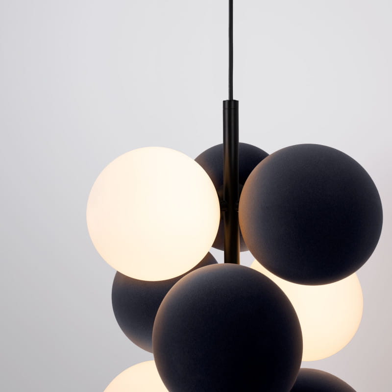 Lampa wisząca "Vino" marki Abruzzo to nowoczesne oświetlenie, które łączy w sobie elegancję i funkcjonalność. Jej głównym elementem są szklane kule świetlne oraz dzwiękochłonne kulki w kolorze szarym, co nadaje jej nowoczesny i minimalistyczny wygląd.