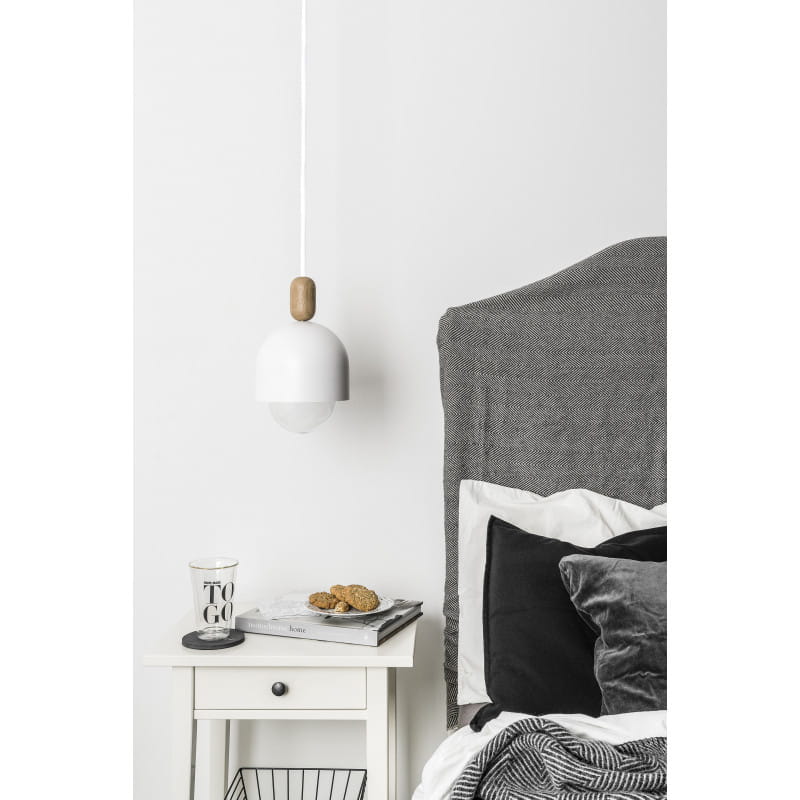• lampa wisząca • długość całkowita 1,25 m • oplot bawełniany B09 biała perła • element wykonany z drewna dębowego • metalowy klosz lakierowany w kolorze białym strukturalnym fi170mm wys. 140mm • gwint E27 • max.15W LED • metalowa maskownica sufitowa lakierowana w kolorze białym strukturalnym fi 120mm • 2 x blokada kabla • przewód dwużyłowy 2 X 0.75mm2 • w zestawie nie ma żarówki (kup)