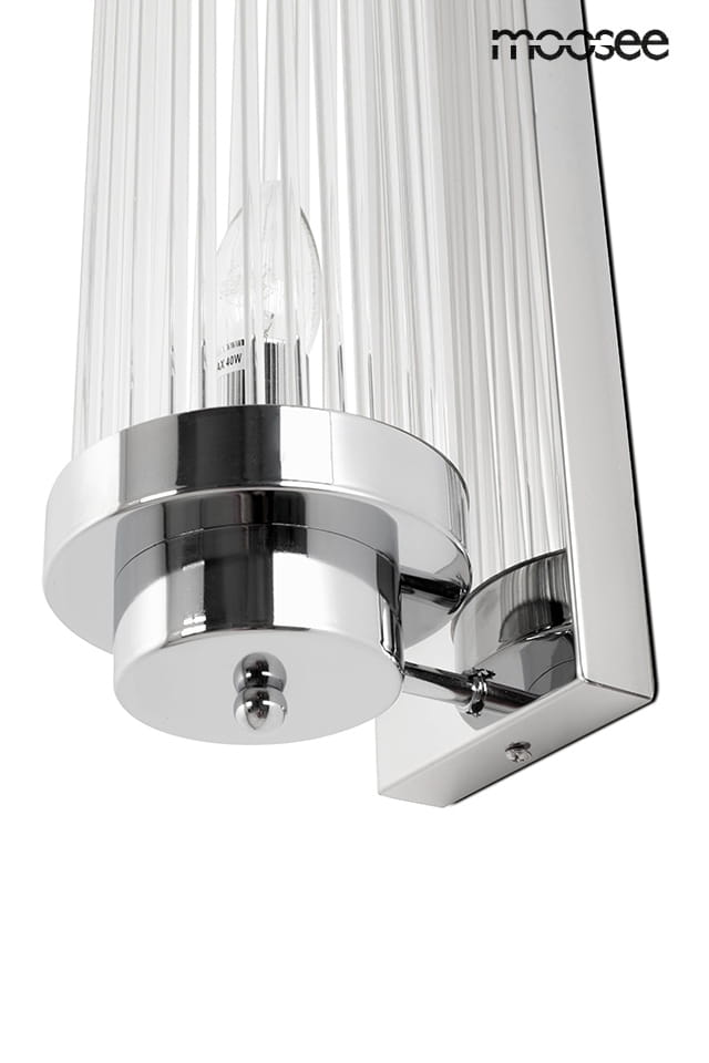 MOOSEE lampa ścienna COLUMN 40 srebrna.Elegancka osłona kloszy wykonana została ze stali chromowanej.Wewnątrz oprawy zamocowane są delikatne szklane klosze, które skutecznie rozpraszają światło.Obrotowe mocowanie pozwala na ich skręcenie, co tworzy wspaniały efekt wizualny.Column doskonale sprawdzi się we wnętrzach w stylu glamour.Światło: 2 x E14 max. 40 W (brak w zestawie)Wymiary: wys. 41,5 cm / szer. 12 cm / gł. 16,5 cmMocowanie: wys. 40 cm / szer. 10 cm / gł. 2,5 cmMontaż: instalacja ściennaWaga netto: 2,4 kgWymiary opakowania: 46 cm / 21 cm / 20 cm.