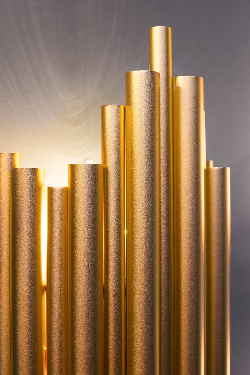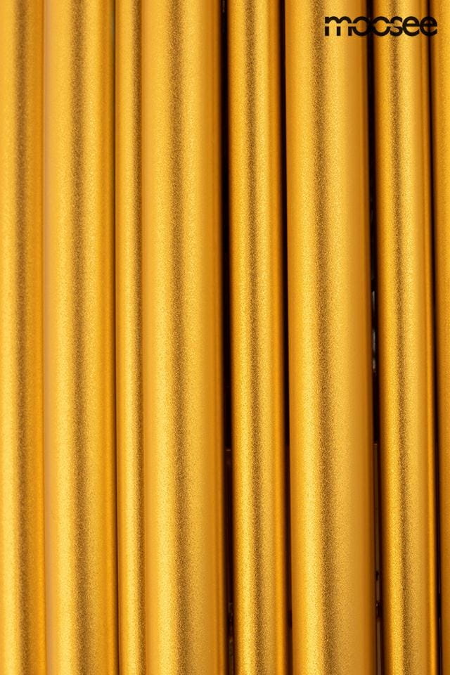 MOOSEE lampa ścienna HARMONIC złota.Kinkiet został wykonany w całości ze stali nierdzewnej w kolorze złotym.Klosz z nieregularnie ułożonych elementów sprawia, że strumień światła zostaje rozproszony w ciekawy sposób.Światło: 2 x E14 max. 40 W (brak w zestawie)Oprawa: wys. 50 cm / szer. 20 cm / gł. 12 cmMocowanie: wys. 10,5 cm / śr. 13,5 cmMontaż: instalacja ściennaWaga netto: 3,2 kgWymiary opakowania: 57 cm / 25 cm / 17 cm.