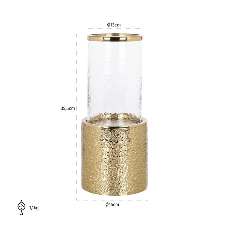 RICHMOND świecznik MARLOU S złoty. Pełny szyku i elegancji świecznik Marlou marki Richmond Interiors został wykonany z aluminium w szampańskim złotym kolorze i przezroczystego szkła. Prosta forma oraz błyszczące wykończenie, idealnie nada się do ozdobienia wnętrz Glamour. Dostępna również większa wersja w rozmiarze L. Wymiary: wys. 35,5 cm / szer. 15 cm / gł. 15 cm Waga netto: 1,1 kg.