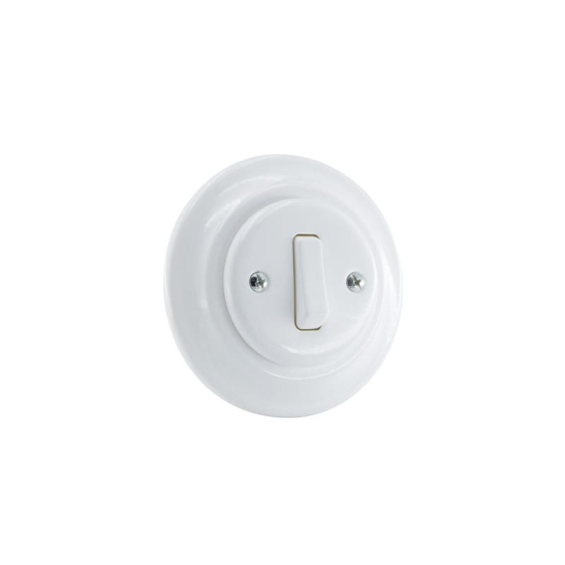 • włącznik światła • podtynkowy z ramką • pojedynczy klawiszowy • schodowy • kolor biały • materiał wykonania ceramika powlekana porcelaną • odległość od ściany 40mm • średnica z ramką 110mm • średnica bez ramki 100mm • IP20 • 10AX 250V