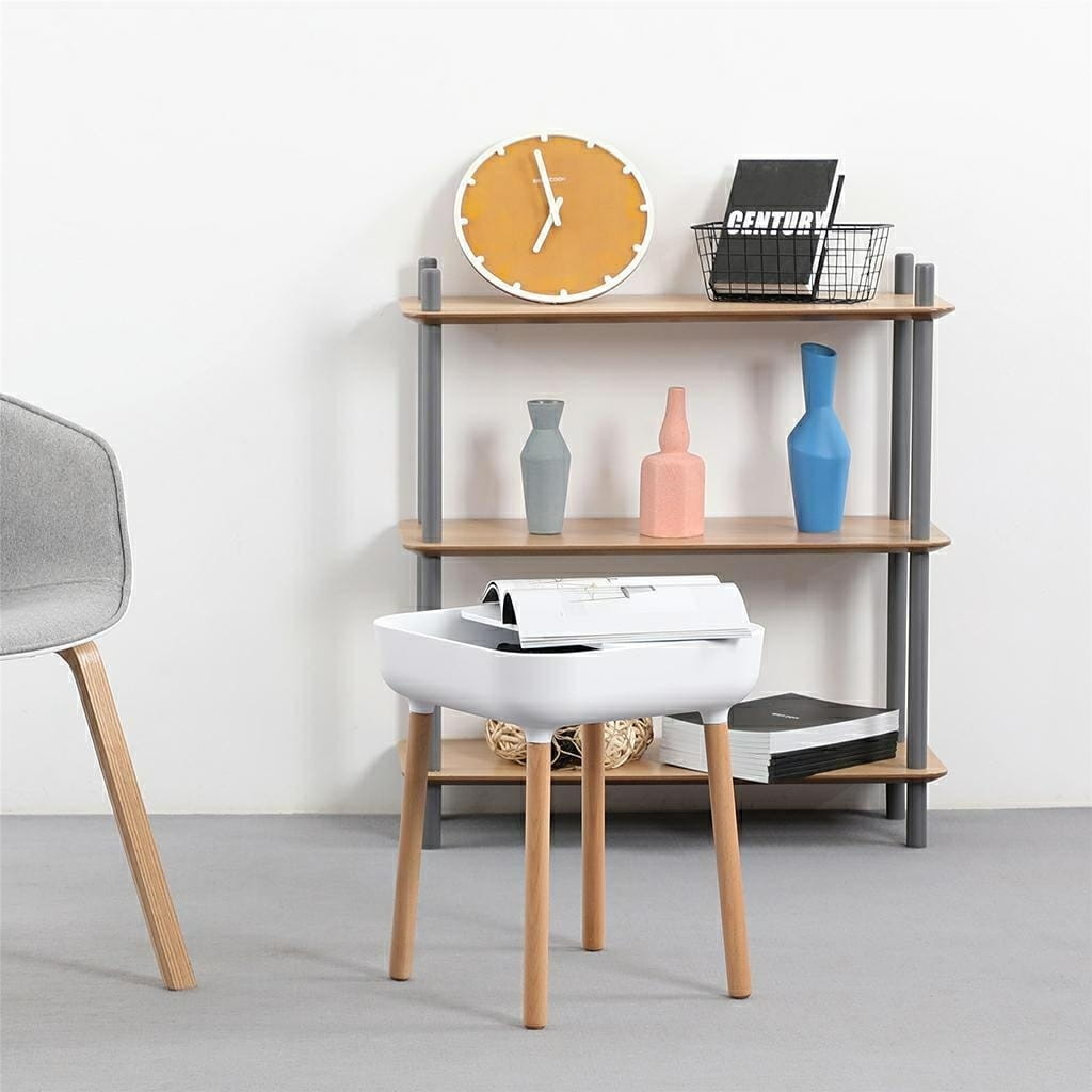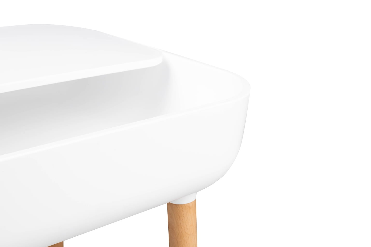 Stolik BOWER biały.Blat z praktyczną półką wykonany został z polipropylenu w kolorze białym z dodatkowym miejscem na przeprowadzenie przewodu,co znacznie ułatwia organizację. Nogi z drewna bukowego sprawiają, że stolik świetnie odnajdzie się w stylu skandynawskim.Wymiary: wys. 47 cm / szer. 39,5 cm / gł. 39,5 cmBlat: gr. 8 cm / szer. 33 cm / gł. 33 cmPółka blatu: 39 cm / 24,5 cmRozstaw nóg: szer. 33 cm / gł. 33 cm / wys. 35,5 cmOtworu na kabel: śr. 3,5 cmWymiary opakowania: 41 cm / 41 cm / 13 cm.