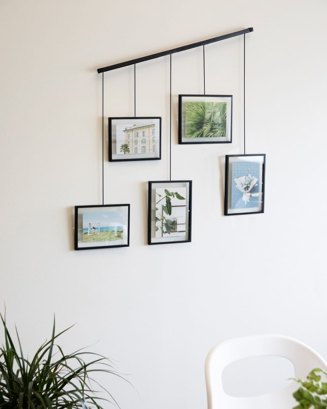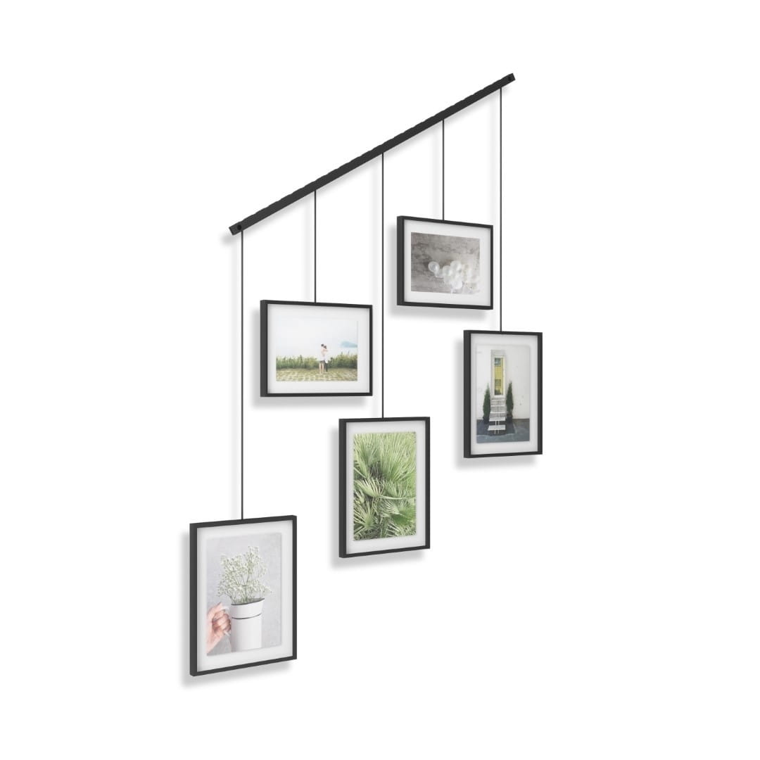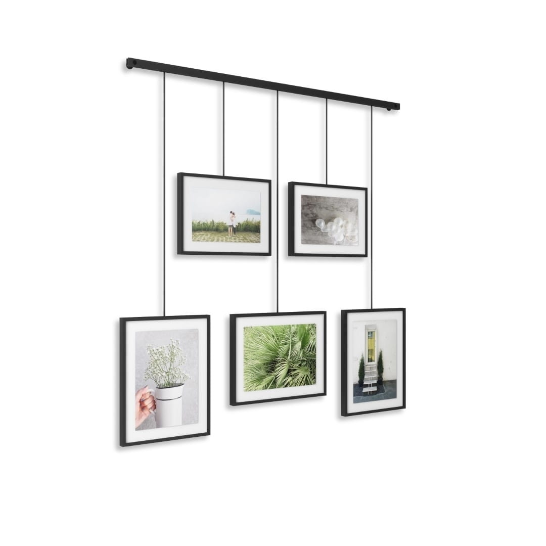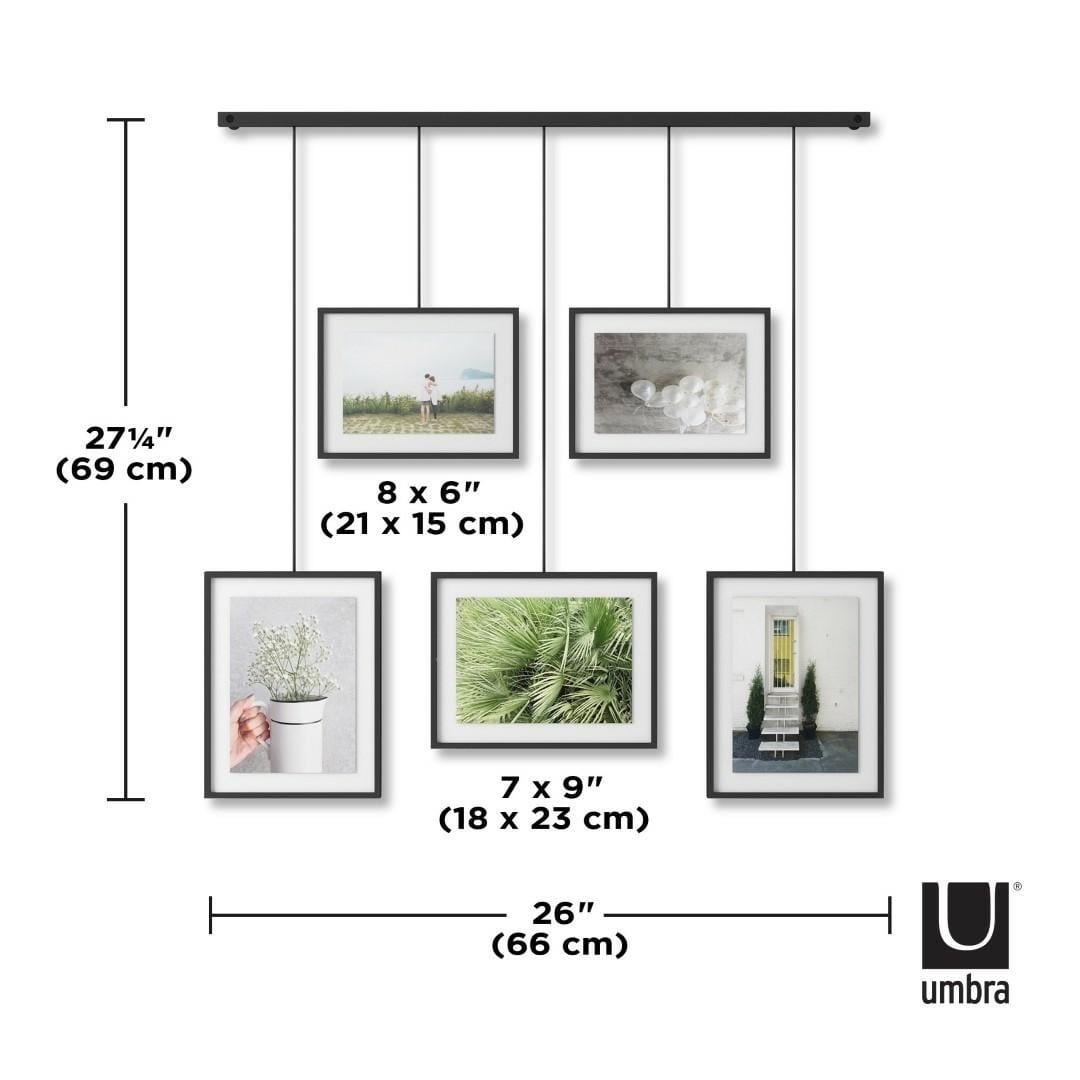 UMBRA ramka na zdjęcia EXHIBIT w kolorze czarnym. Jest to zestaw pięciu ramek, zamocowanych na metalowej półce z klipsami i wspornikami do przechowywania zdjęć o różnych rozmiarach. Wsporniki zamontowane na listwie, która pozwala na dowolną konfigurację ramek ze zdjęciami w celu tworzenia nowych układów. Będzie to świetna dekoracja w salonie, sypialni, przedpokoju czy biurze. Wymiary ramek: Dwie ramki: 10 cm × 15 cm Trzy ramki: 13 cm × 18 cm Waga: 2,5 kg.