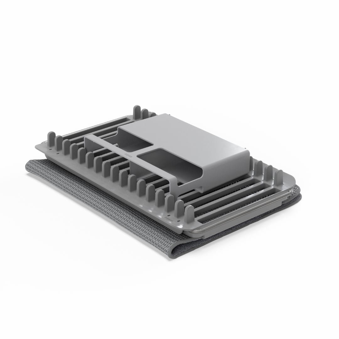 UMBRA suszarka na naczynia w kolorze jasno-szarym. Jest to praktyczna suszarka, wyposażona w chłonną mate wykonaną z mikrofibry. Wyposażona jest w stojak, na którym możemy bez problemu suszyć nasze naczynia. Posiada 16 przegródek na talerze, tace, szklanki i inne przybory kuchenne. Posiada wysuwane ramiona, które zaczynają się od 33 cm i rozciągają do maksymalnie 56 cm. Jeżeli nie będziemy z niej korzystać, wystarczy ją złożyć i schować w szufladzie lub szafce.