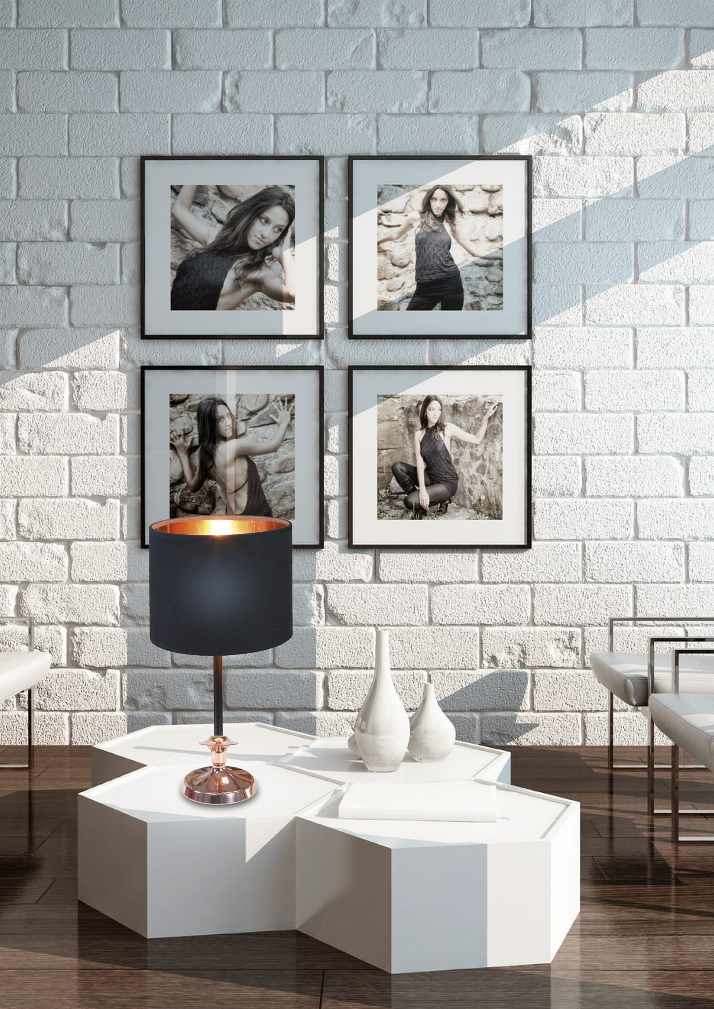 tajemnicza elegancja: nastrojowa czerń w połączeniu z miedzią; abażur z błyszczącym miedzianym wnętrzem; prosta czarna podstawa z miedzianymi elementami ozdobnymi i miedzianą stopką